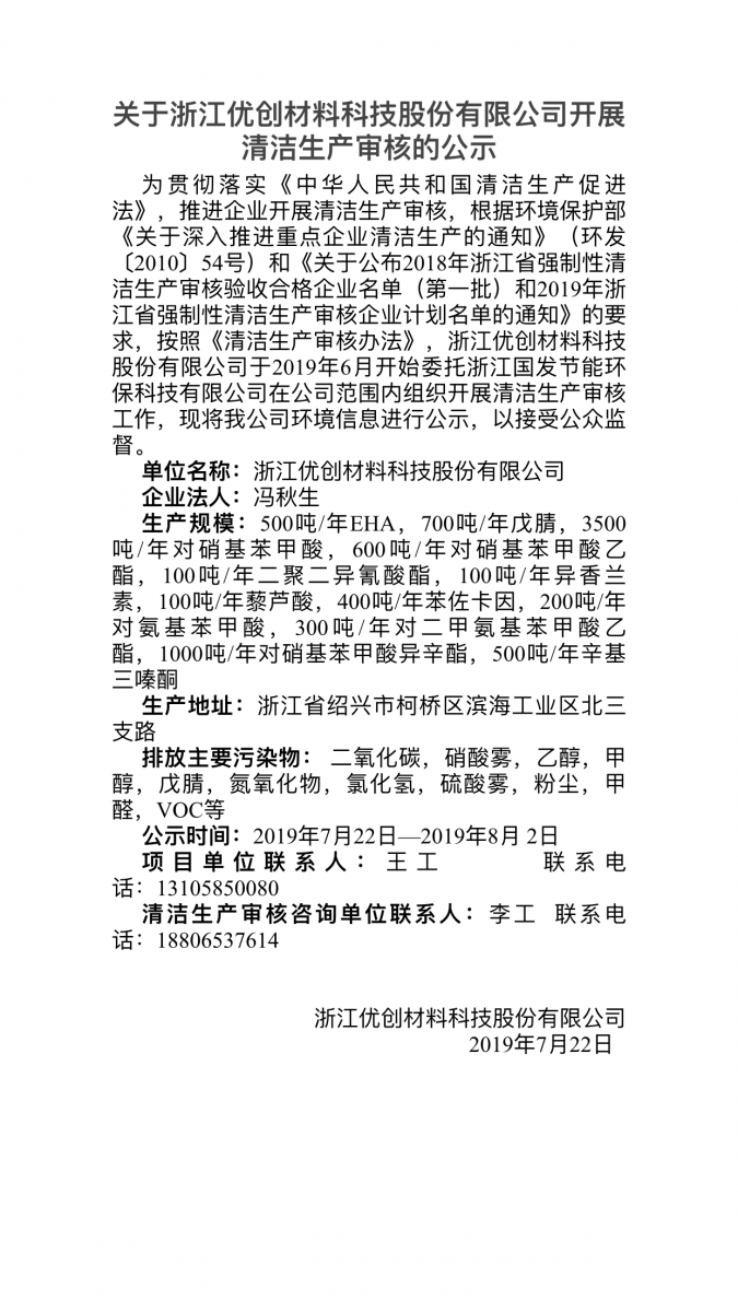 關(guān)于浙江優(yōu)創(chuàng)材料科技股份有限公司開展清潔生產(chǎn)審核的公示